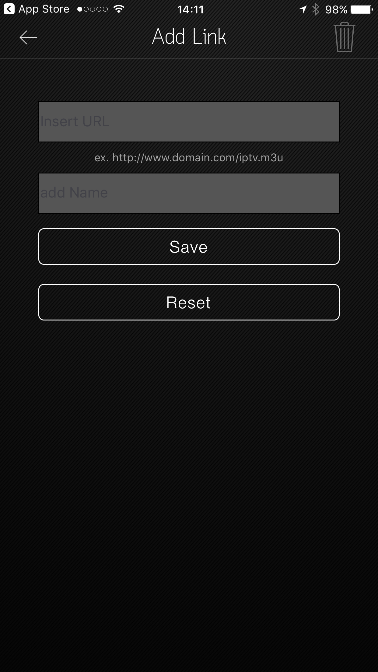 2. Após instalado, abra o aplicativo e clique no icone ADD LINK, solicite a lista de canais teste. Em seguida basta você inserir a URL recebida no campo indicado, adicione um nome qualquer para a sua lista de canais e depois clique em Save. conforme imagem abaixo: